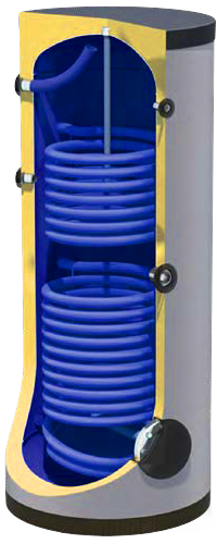 □ Serpentin interne en acier robuste (type Tubo) en option intégré dans la partie supérieure du réservoir, pour le raccordement à la source de chauffage secondaire.