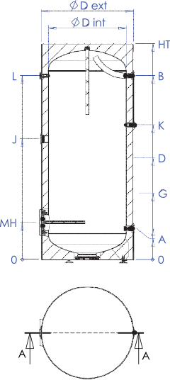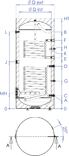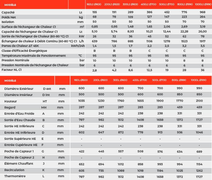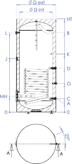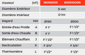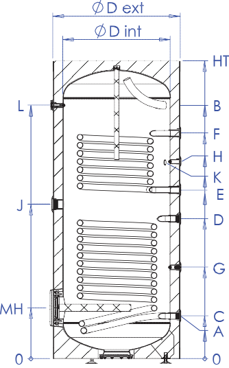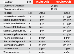 ■ Échangeurs de chaleur pour le transfert d’énergie thermique :□ Serpentin interne en acier robuste (type Tubo) intégré dans la partie inférieure du réservoir, pour le raccordement au capteur solaire.