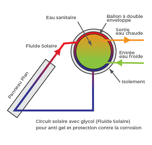 Le liquide caloporteur est ensuite dirigé vers le ballon de stockage. La chaleur absorbée et transférée à l’eau sanitaire par le biais d’un échangeur, avant de repartir refroidi vers le capteur. La circulation de l’eau au sein du système est assurée par le phénomène naturel et thermosiphon. L’eau chaude, plus légère que l’eau froide, monte établissant une criculation naturelle, sans pompe donc sans risque de panne, entre le capteur et le ballon où l’eau chaude est stockée. Le systéme thermosiphon est le systéme thermique le plus performant, robuste et sans émission de gaz à effet de serre.